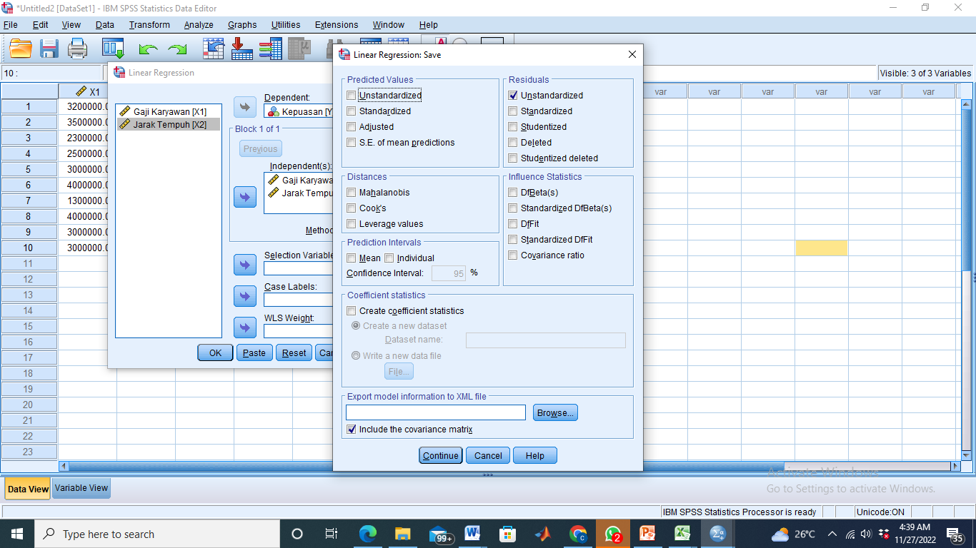 Klik Save – centang Unstandardized pada kotak Residuals – Continue – OK